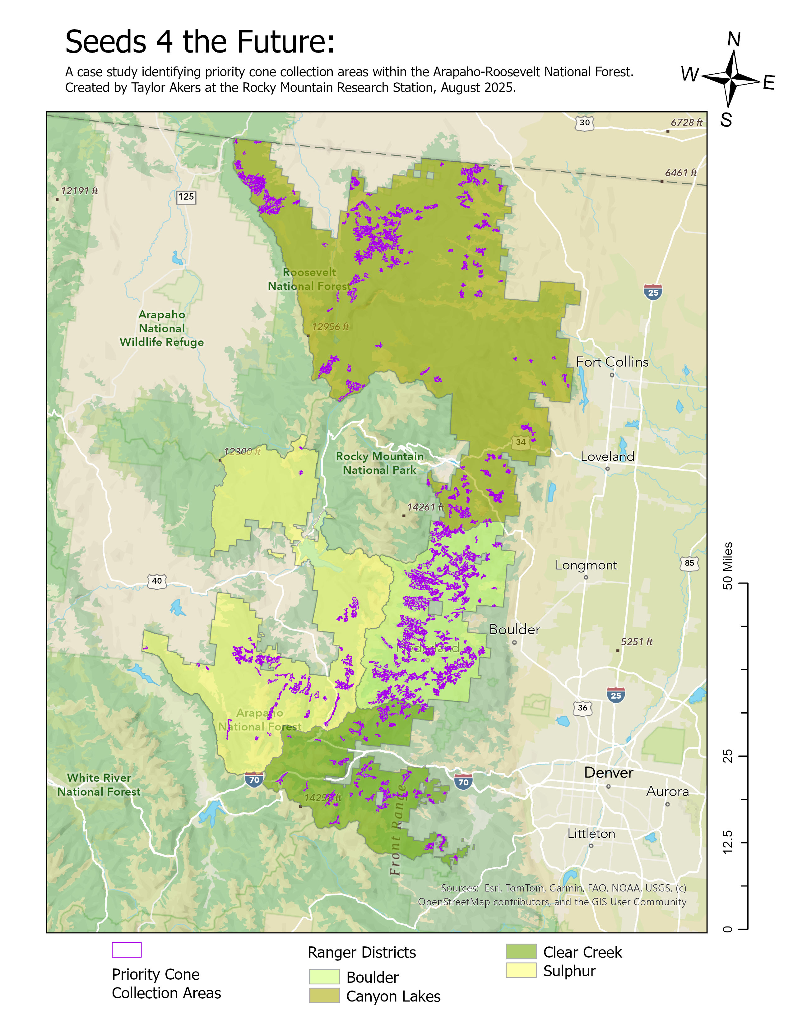 Here is a map that I created using R studio and ArcGIS Pro to showcase pirority areas for conifer cone collection within the Arapaho-Roosevelt National Forest.